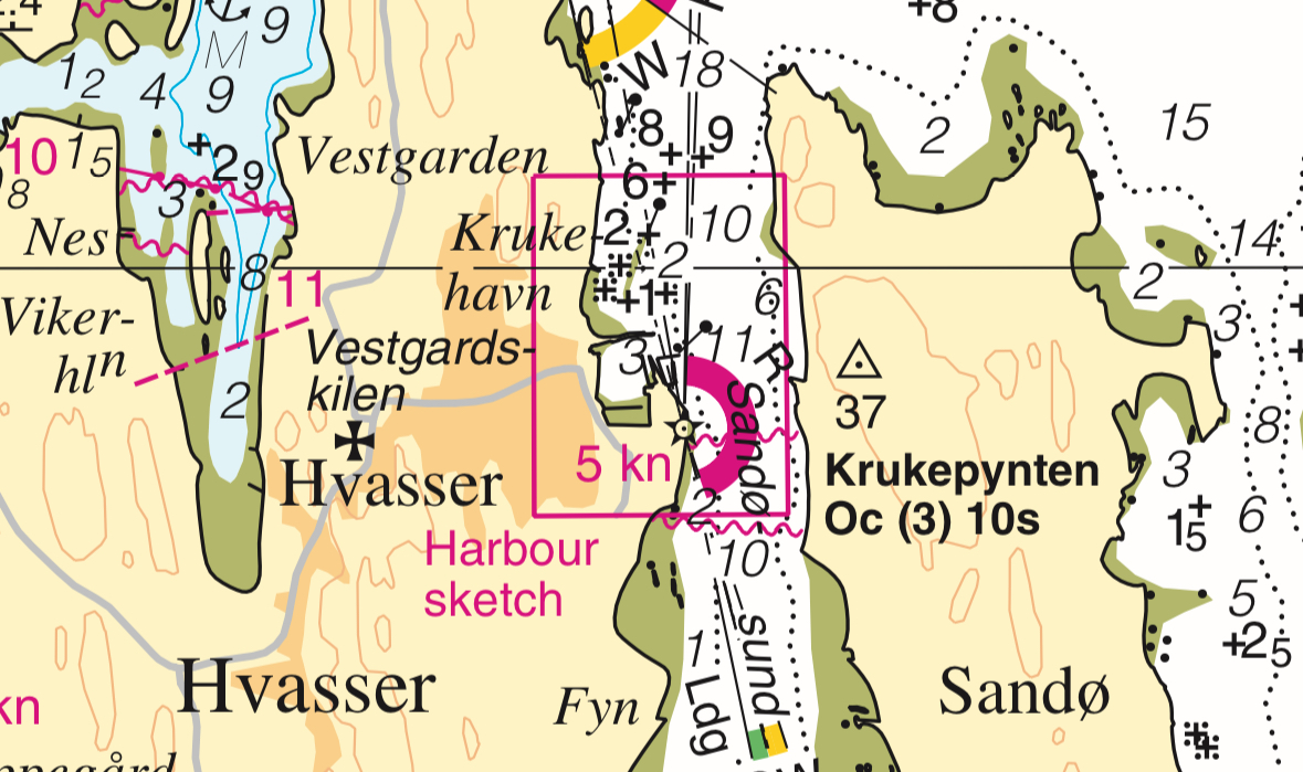 Over ser du et utsnitt fra sjøkart A - Tjøme. Her ser du et område med maksimal fart tegnet inn.
