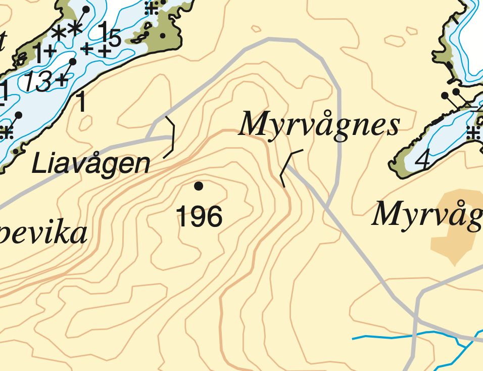 Over ser du en vei vist på sjøkartet. Kartet viser også at veien går gjennom en tunell.
