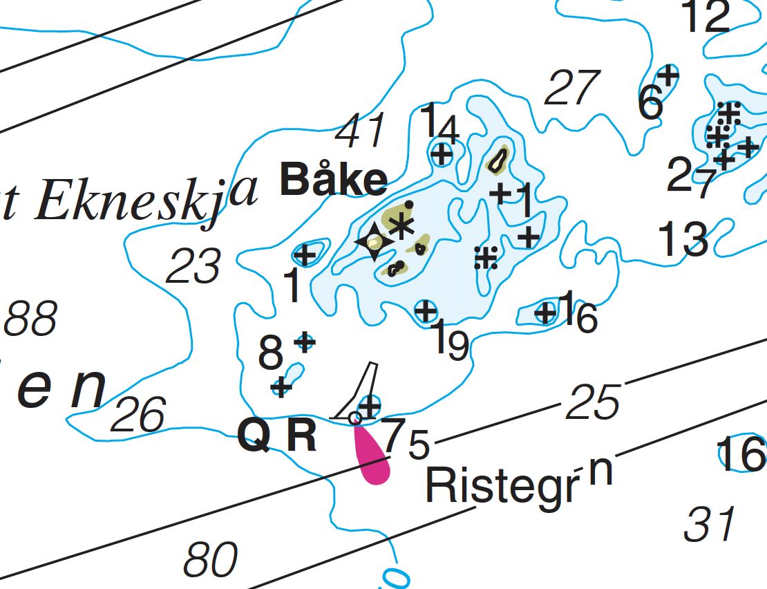 På sjøkartet er båkene markert, men merkene kan være forskjellige fra kart til kart.