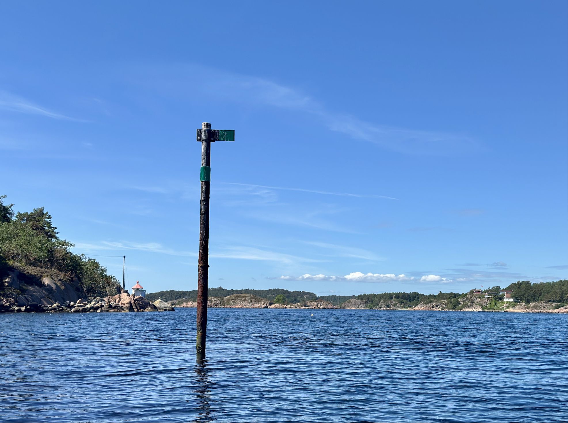 På bildet over ser du at armen peker i rettning rent farvann. Det er likevel ikke definert en fast avstand fra merket til trygt farvann.